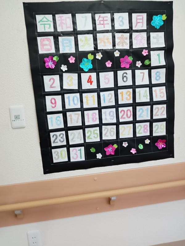 完成したカレンダーは、施設のフロアに飾られ、春らしい明るい雰囲気を演出しています。