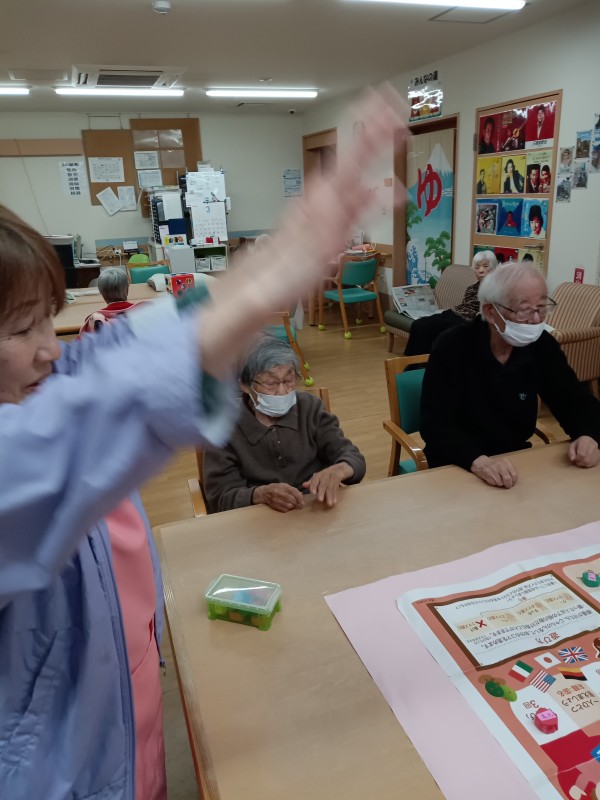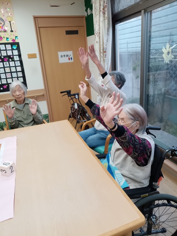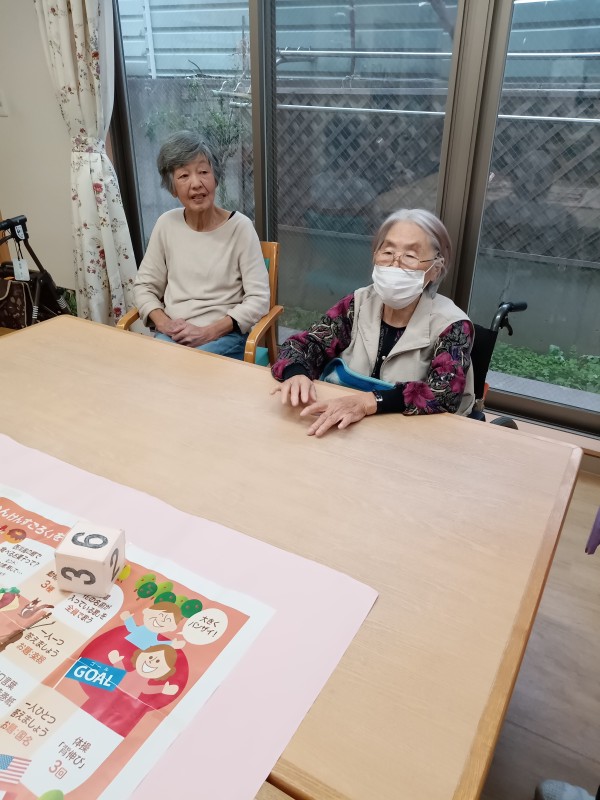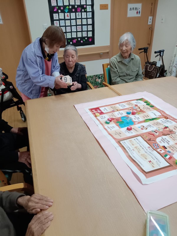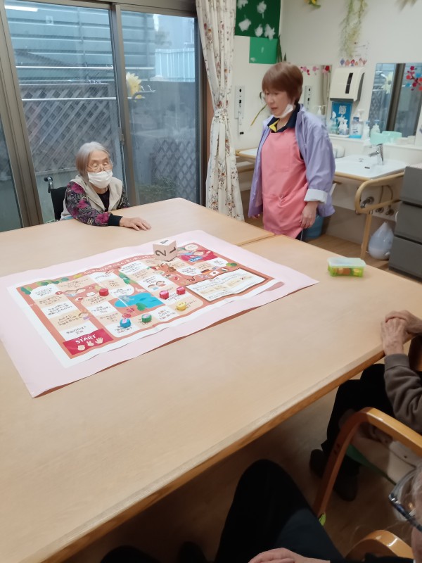 今日は、手作りの大きなすごろくを使ってレクリエーションを行いました! サイコロを振って進み、「歌を歌う」「好きな食べ物を言う」などのお題に挑戦。止まるたびに笑いが起こり、「懐かしいね」と会話も弾みました。