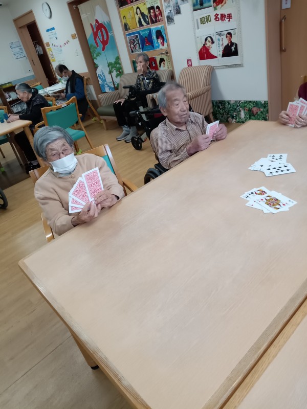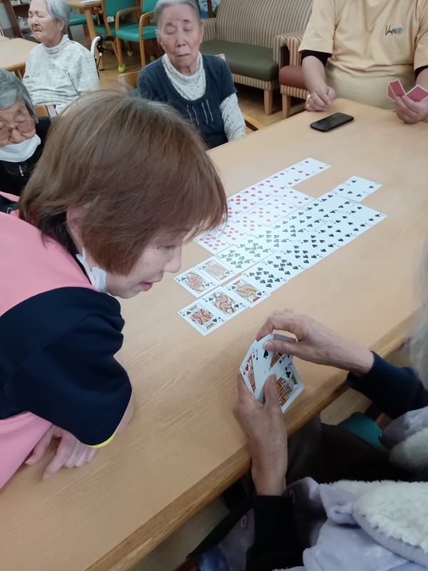 昨日の七並べで大盛り上がりだったので、今日のレクもトランプゲームです! 七並べ、ババ抜きを楽しんでいるみなさんの笑顔をお届けします~
