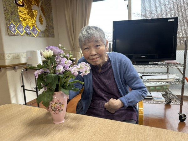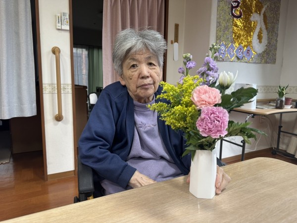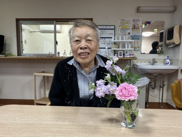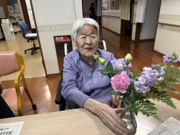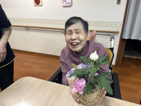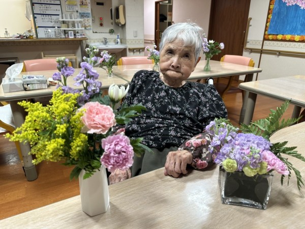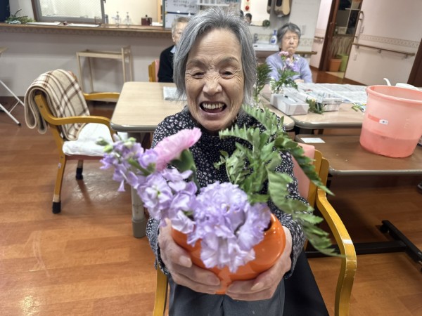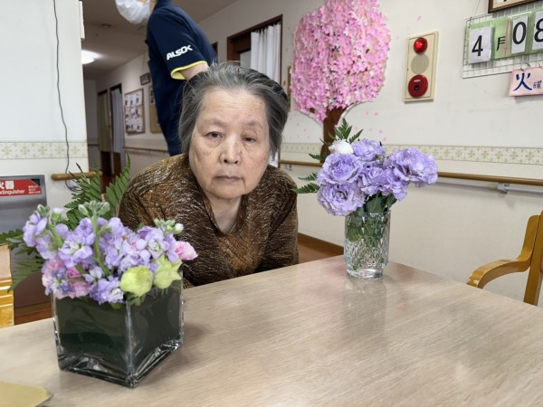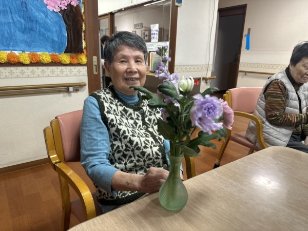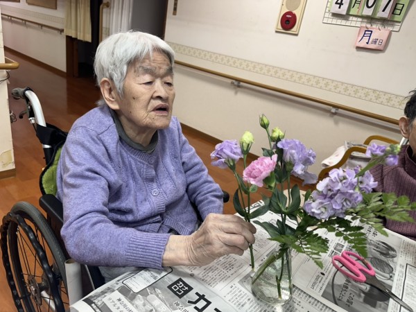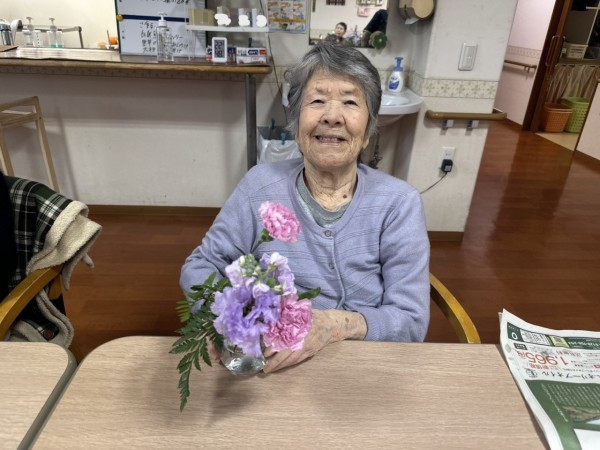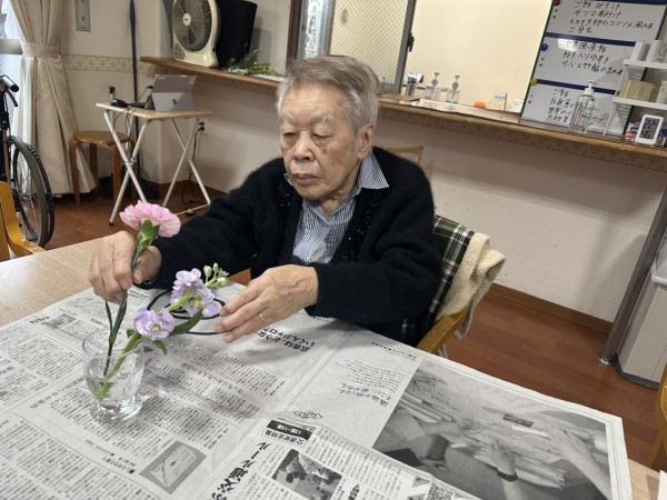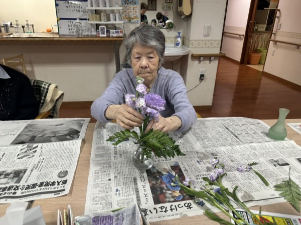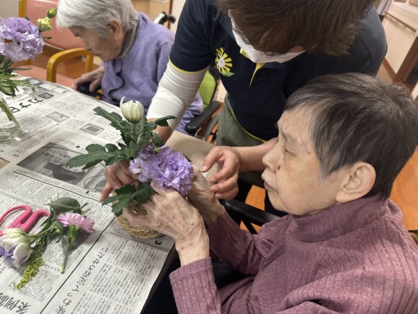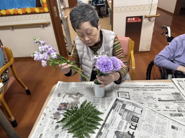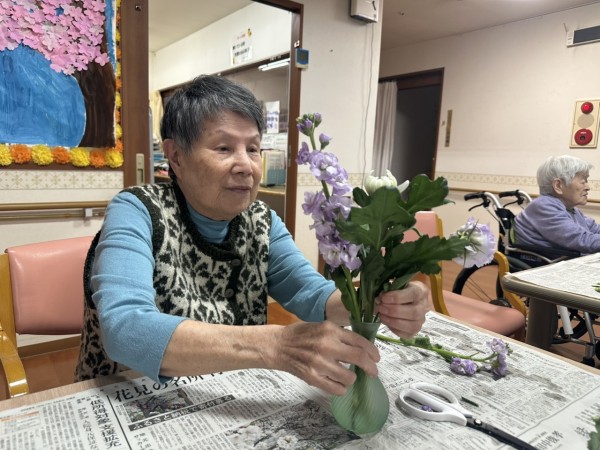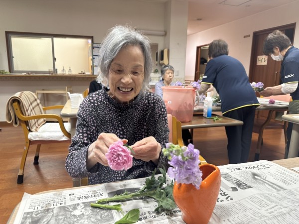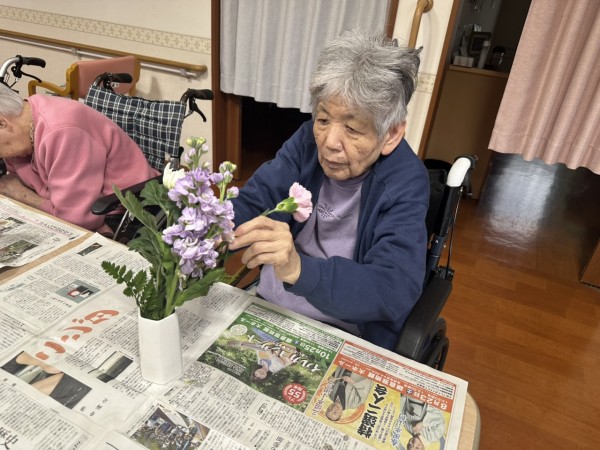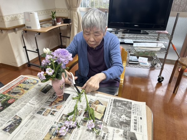 普段レク等あまり積極的に参加されないご利用者様も、慣れた手つきで茎を切ったり花の向きを調整したりされていました。