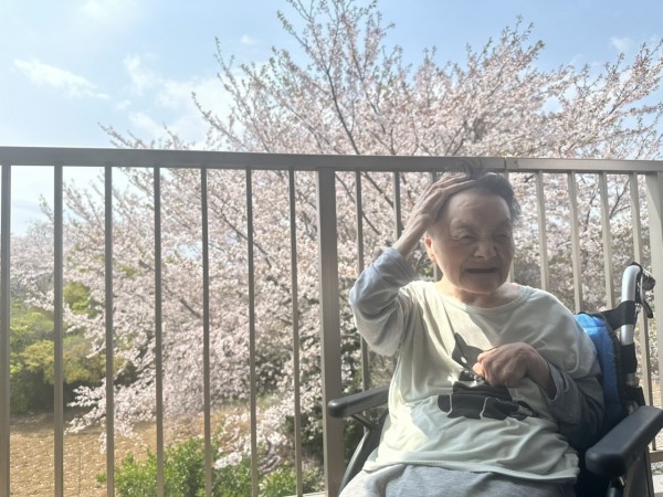皆さん花を見ると穏やかな笑顔になられます。グループホーム横浜いずみ野の外は桜が満開です。