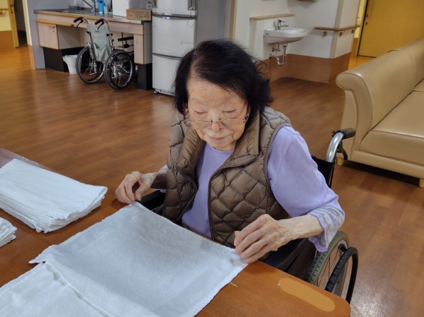 こちらの奥様は、せっせとおしぼり畳み。クルクル巻く前のひと作業。