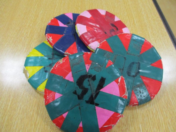 お手玉みたいに柔らかくなく、円盤状なので的に入っても跳ね返ってしまったり、的と的の間に当たってしまうなど結構難しいようです…