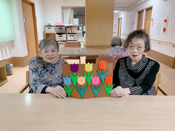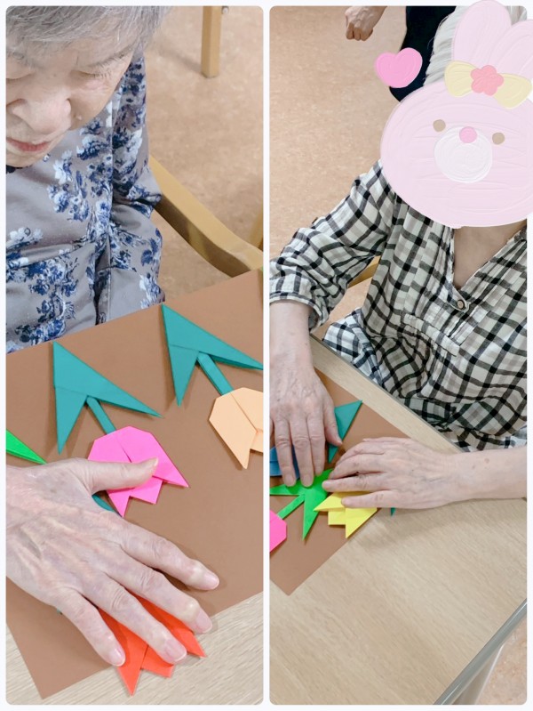 早速皆さんの力を借りて、折り紙でチューリップを作っていったのですが…