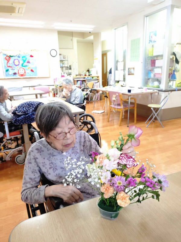 1階のデイサービスの利用者さんと共に…ピンクのバラやオレンジ色のカーネーションなどがあり、お部屋全体がとても華やかになりました。(5月になればあっという間に母の日ですね)