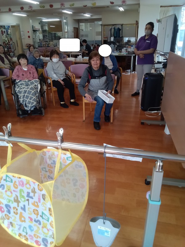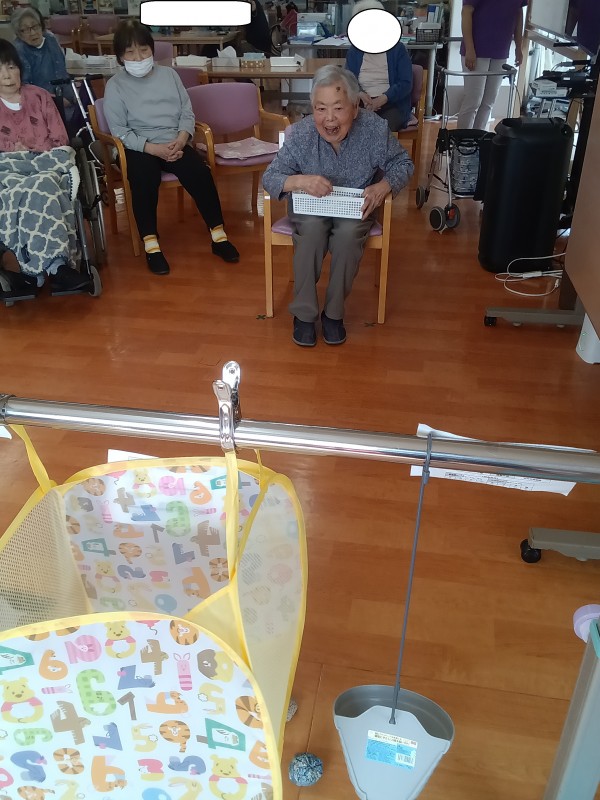 平行棒に色々入れ物をぶらさげて、そこにお手玉を投げ入れていきます。