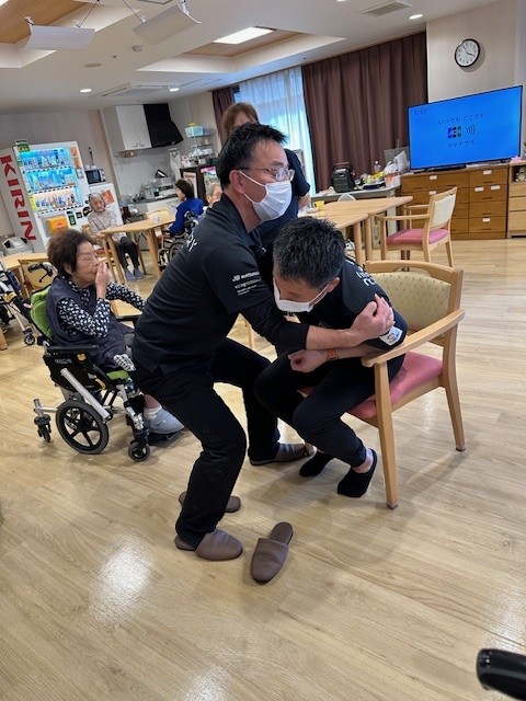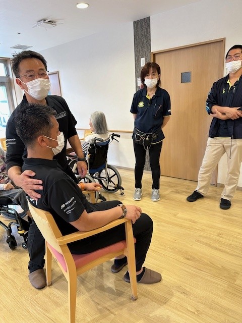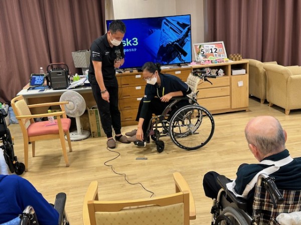 1時間の講演のあとは、個別で姿勢が崩れやすい入居者様に正しい座り方と正しい車椅子の選定を行ってくださいました。職員、一番の食いつき所です!!!