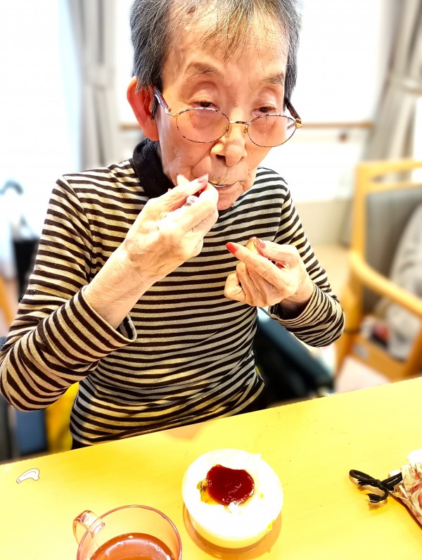 施設では、あまり食べれない特別に特別プリンアラモードが提供されました。