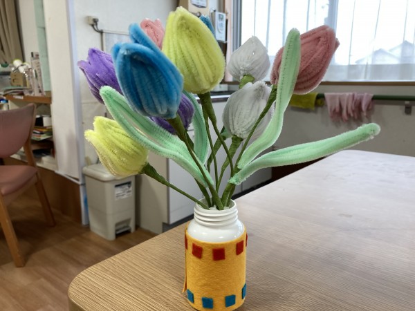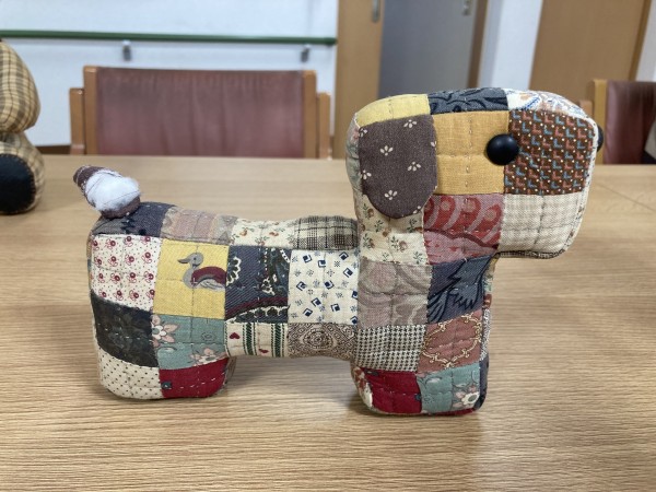 入居者様のご家族が持ってきてくださいました。前回はチューリップで今回はヒマワリ。お聞きすると、モールを様々な形に加工して作られたそうで、こういったお花のクラフト作品は「モールフラワー」という名称とのこと。ご家族はユーチューブを観ただけで作ったそうですが、その器用さは母譲り。お母様もパッチワーク等手芸がとってもお上手です。以下はお母様の作品一例。