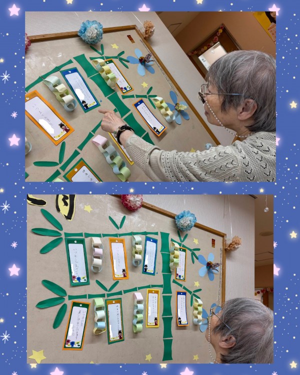 七夕飾りに囲まれて皆様お願い事を考えています☆短冊に願いを込めて・・・☆