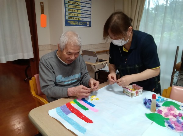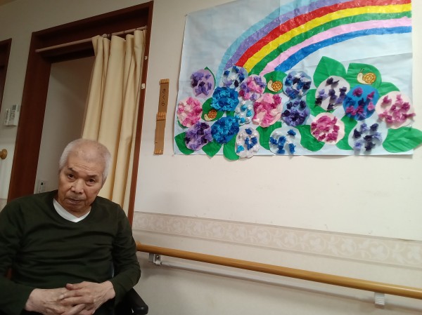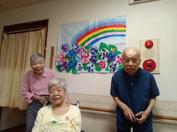 虹を作成の為、折り紙でちぎり絵です。細かい作業でしたが、少しずつ時間をかけて皆さんに貼っていただきました。