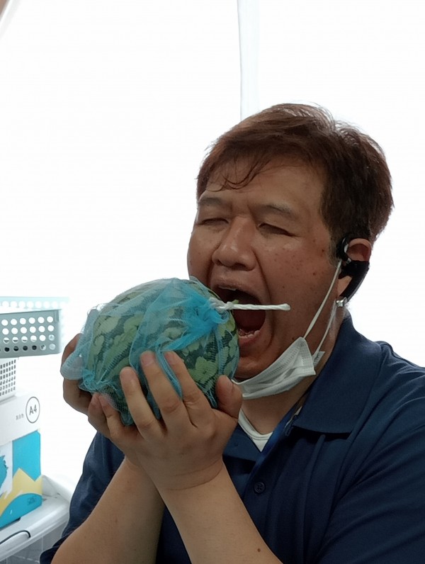 今のうちに大きくなったスイカを収穫しましょう。ということで3階のお客様と4階テラスへ。