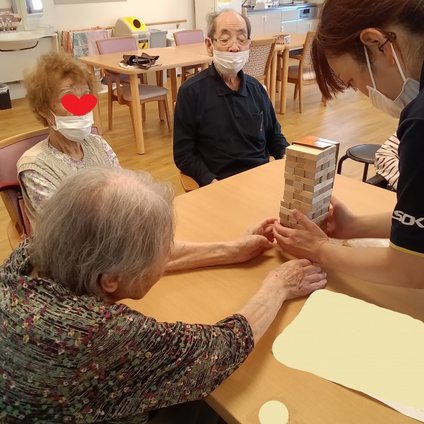 いつもテレビを見ているW様とI様、他階からジュースを求めて降りてこられたS様、居室からひょっこりお顔を出されたY様が大盛り上がり!!ジェンガを楽しんでいらっしゃいました。