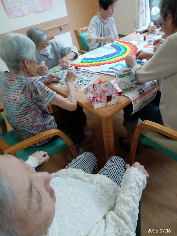 皆で折り紙をちぎって虹の貼り絵を作りました。