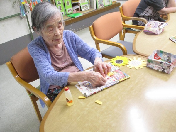 先日、入居者様と8月の2階壁飾り作りを行いました