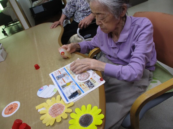 入居者様にもひまわりを作って頂き、ホームの壁に飾りました♪