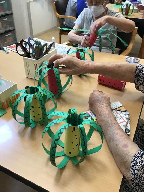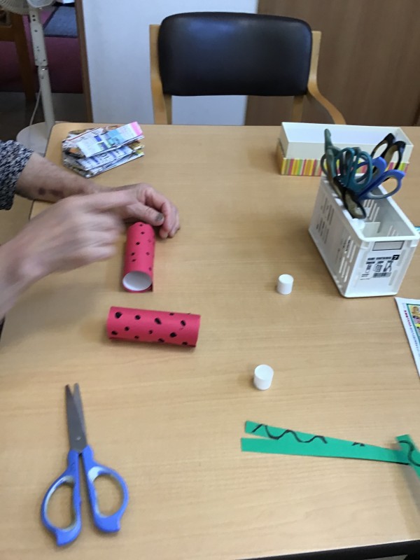 トイレットペーパーの芯にスイカの種を書いた画用紙を貼っていただき、その周りにつけていくいく緑色の画用紙を切っていただき、その緑色の画用紙にはスイカの外側の柄もサインペンで書いていただきます。