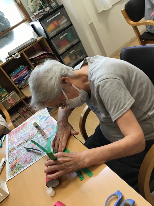 切って緑画用紙に柄を書いた物を赤い画用紙を張り付けたトイレットペーパーの芯にくっつけていただくと、