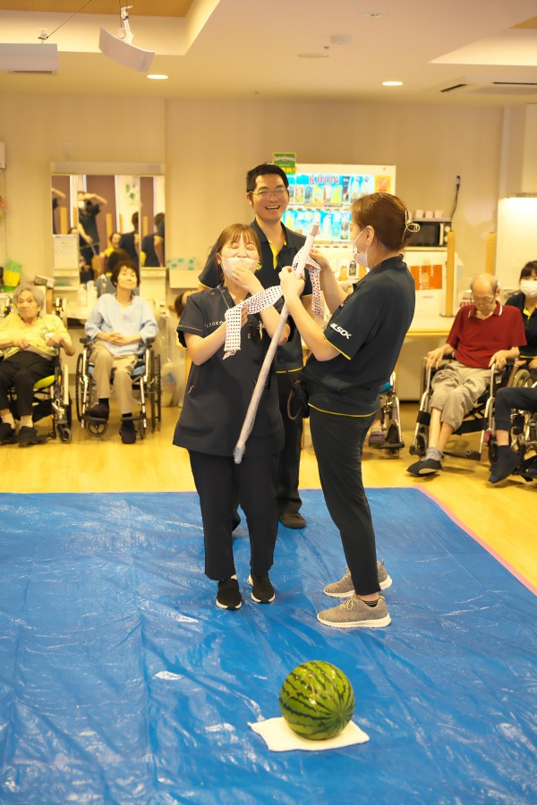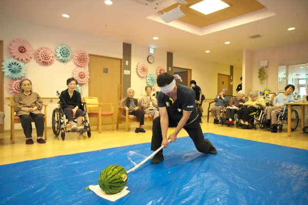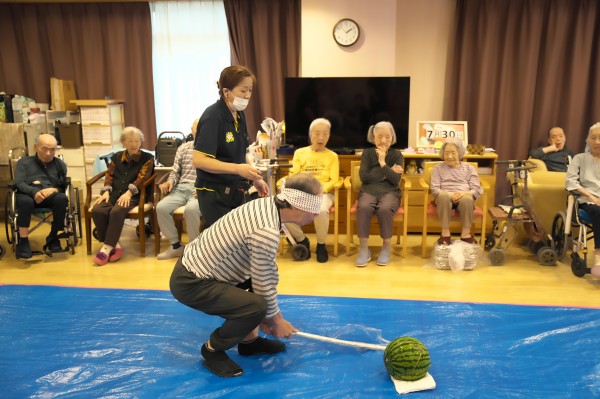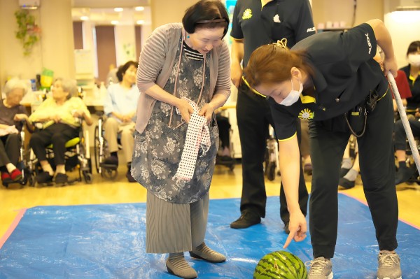 今回は毎年恒例のスイカ割りの様子をご覧いただきたいと思いますー!!