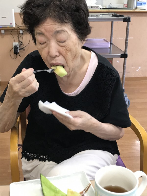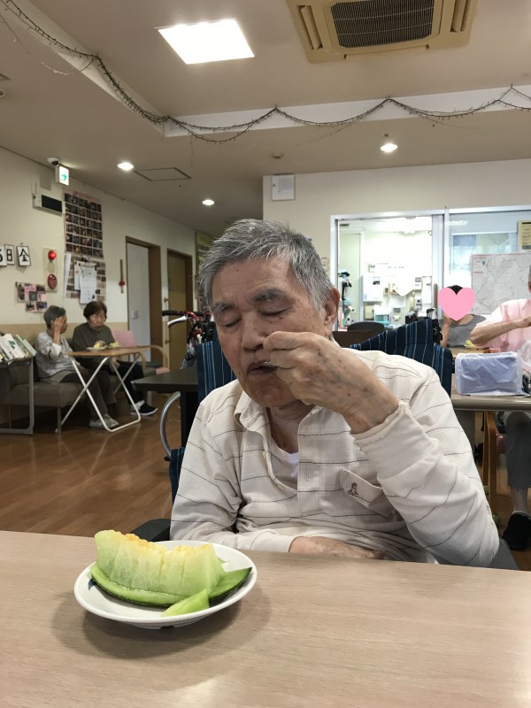 暑い夏日を乗り越えるため、甘味の溢れる果物のメロンを御利用者様方で召し上がられました。