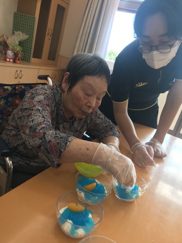 杏仁豆腐の上にゼリーを乗せて最後にミカンで飾りを付けて完成です!!