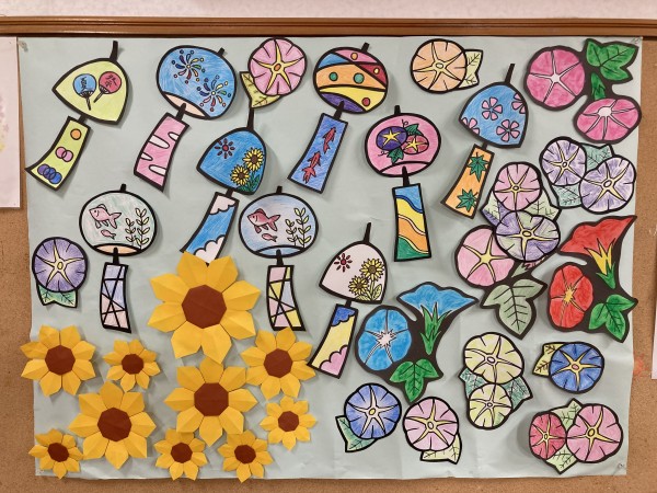 とても良い味を出しています。画用紙にはべったりと貼らずに冷房の風邪などで風鈴が揺れるように貼り付けてあります。