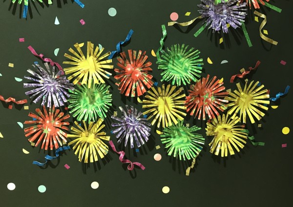 用紙に花火に合ったキラキラのシールを皆様に貼って頂いたりして