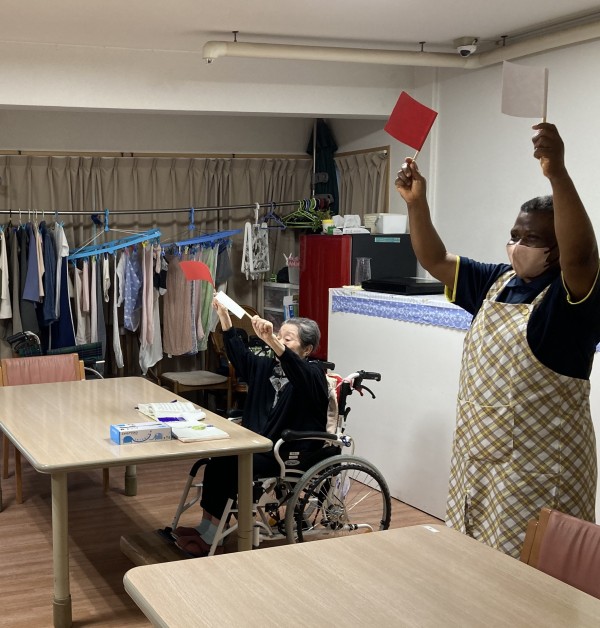 アフリカ出身の職員も初めての旗体操に