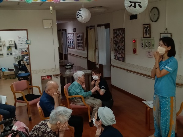 講師の掛け声に合わせて、ご利用者様が職員と一緒にゆったりとした呼吸と口の動きを意識しながら参加されました。