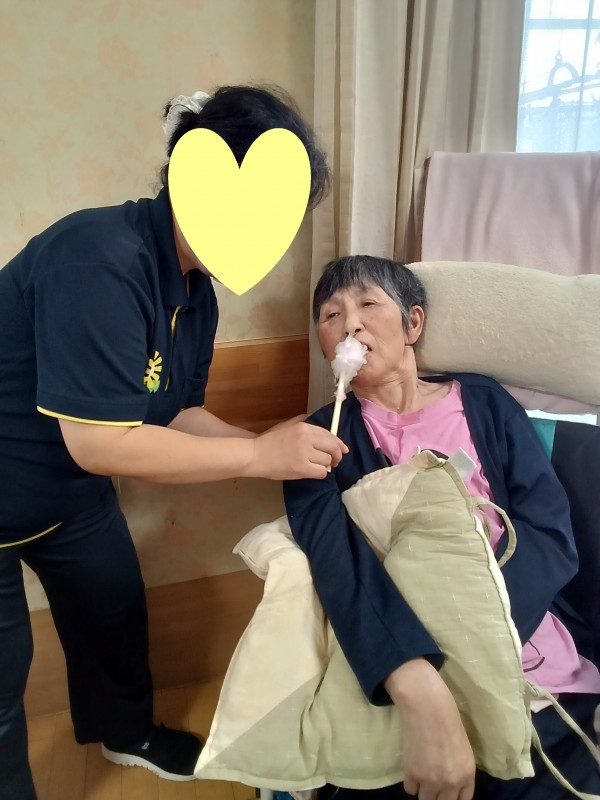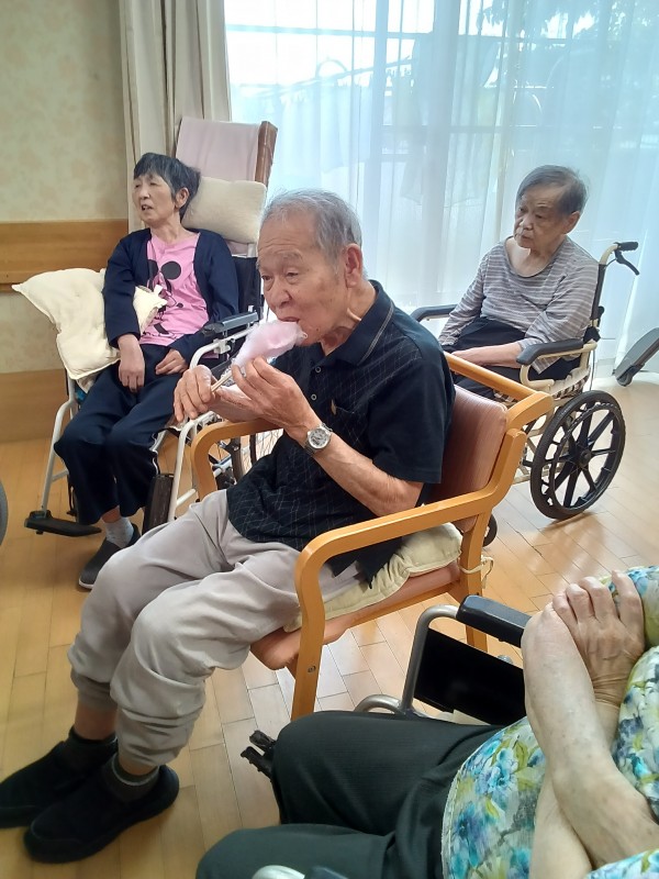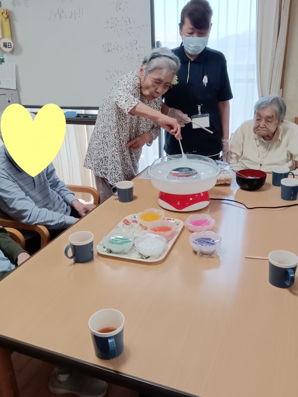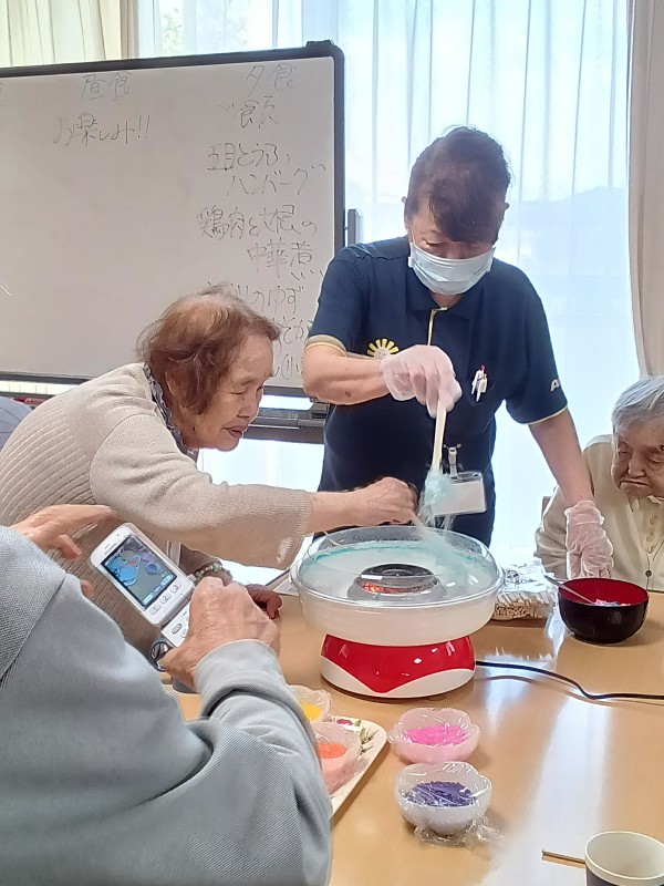 お祭りの屋台に行ったような気分を味わっていただきたく、今回は綿あめ作りを提案しました(*´ω`*)