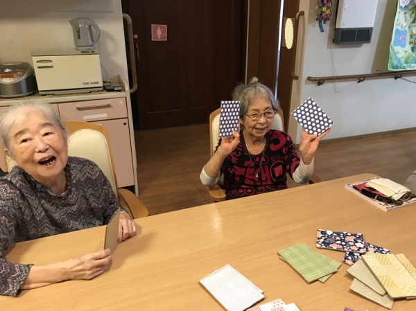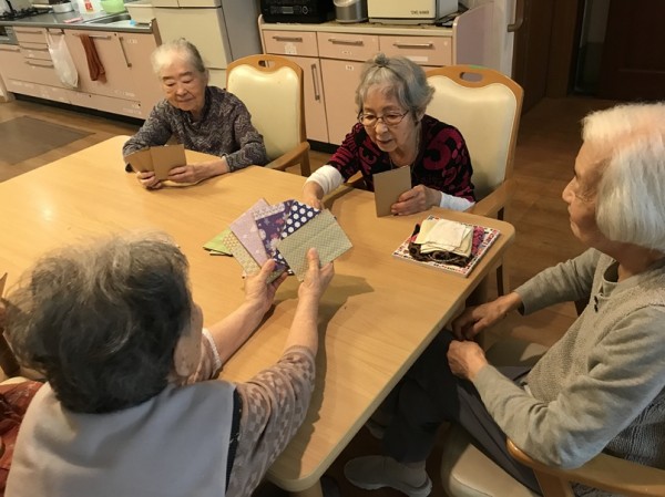段ボールに柄付きの折り紙を貼って作ったカードを使って