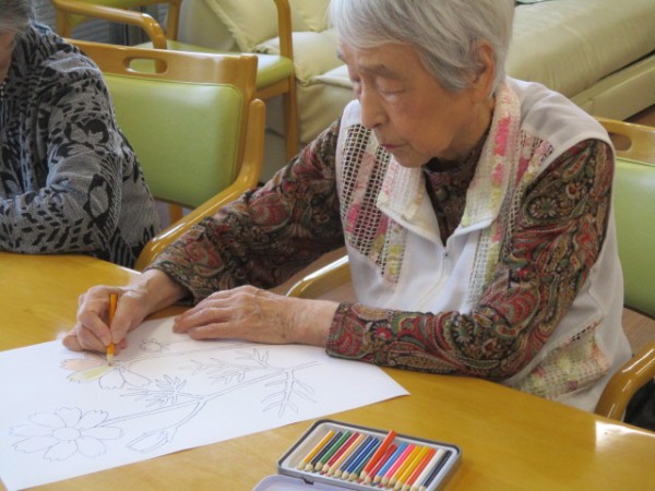コスモスの塗り絵を行っています( ^ω^)・・・ オレンジやピンクの色で塗られたコスモスのお花綺麗ね! と話されていました(*^_^*)
