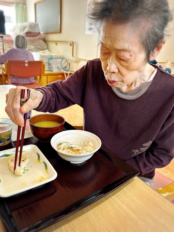 「これなぁに?」とムニエルを召し上がるM様。魚をアルミで包んで美味しく火を通すやつです、と下手糞な説明をすると「ほう!」と納得(?)され、あっという間に完食。「もっと無いの?」とお代わりを所望されておりました(´▽`)