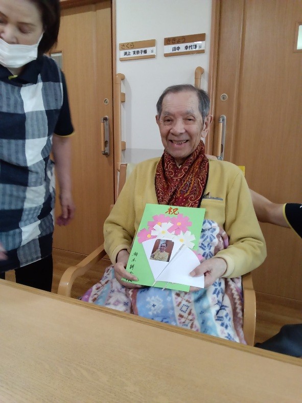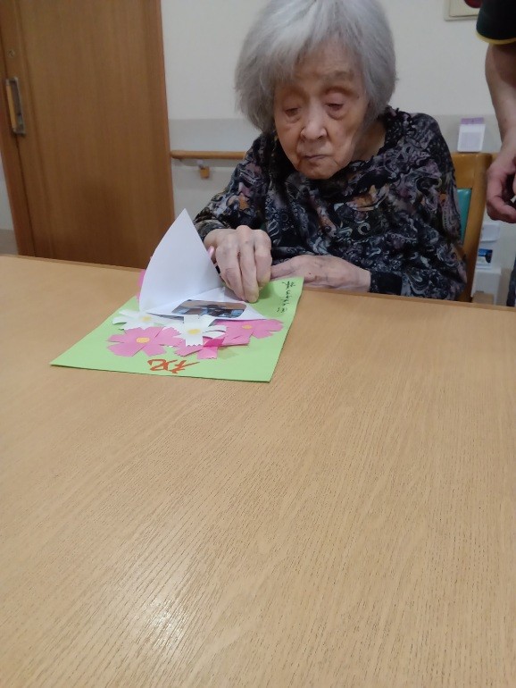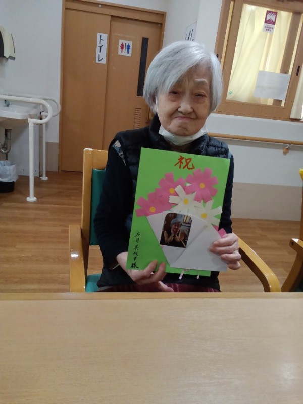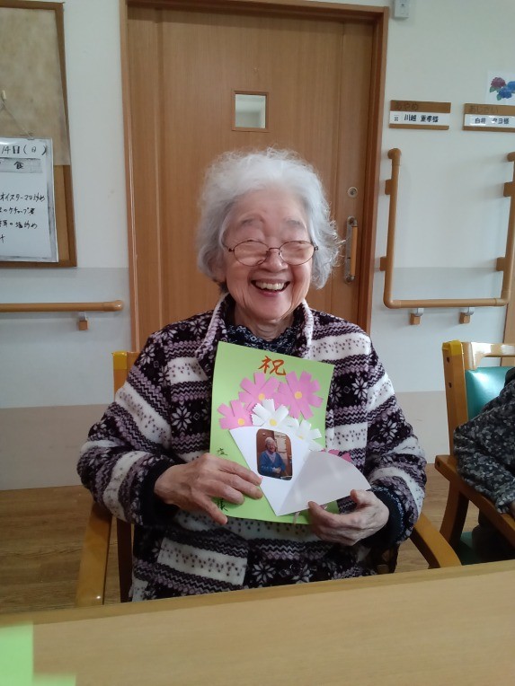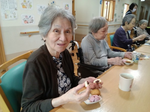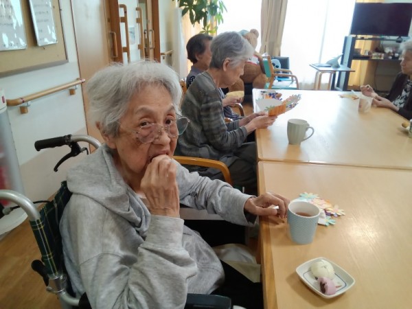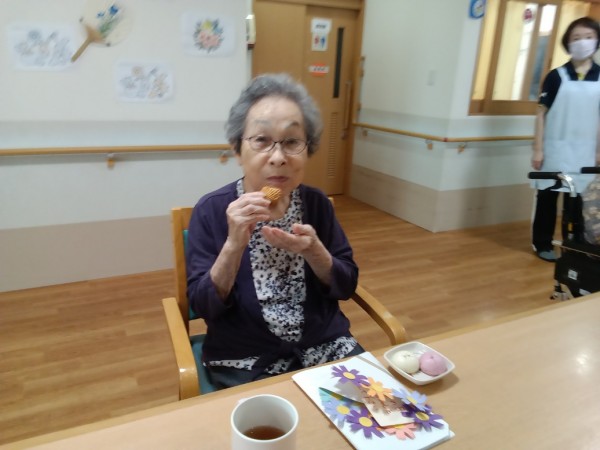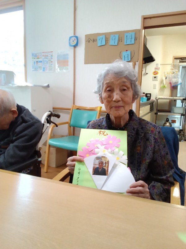 こんにちは、グループホームみんなの家川崎新百合ヶ丘の介護ブログです。前回の続きになります敬老の日レクリエーションのご様子です。皆さん沢山の秋の歌を歌われた後は、お楽しみのおやつの時間になります。職員からのメッセージカードをお渡しさせて頂いた後に、紅白のお饅頭を召し上がられました。