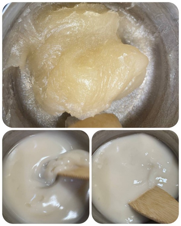 かたくり粉と水と砂糖を、鍋でとにかく混ぜて火にかけます。