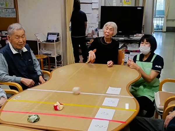 「100点!」「狙いは100点!」とスタッフに煽られながら投げるご入居者様、、、