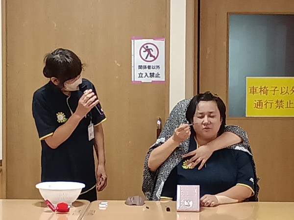 センター長と機能訓練指導員ペア、副センター長と生活相談員ペアによる二人羽織