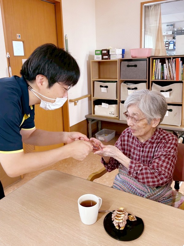 「美味しいですか?」とホーム長に声を掛けられ、ゆっくりと頷き握手を求めるT様。