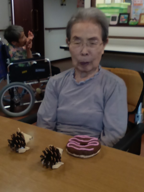 我がNo1.手芸マスターのスタッフが松ぼっくりで制作したハリネズミが入居者様に大好評で笑顔をいただきました