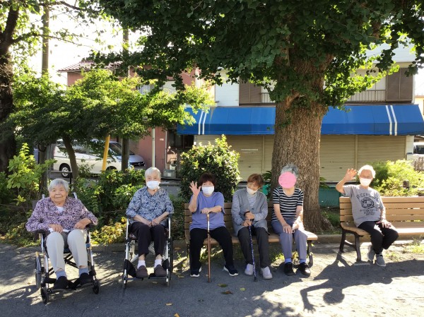 午後のお散歩は午前中とは違う公園に利用者様全員でお出かけです♪歩くのが大変な方は車椅子で移動です。