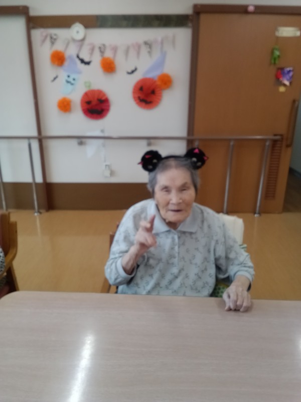 本日はハロウィーンの準備をしていて被り物を出してみるとご入居者様から被り物を見て被りたいと要望がありハロウィーンではないのですが、被ることで皆が盛り上がってしまいご入居者様とハイポーズで写真を撮ってみました。