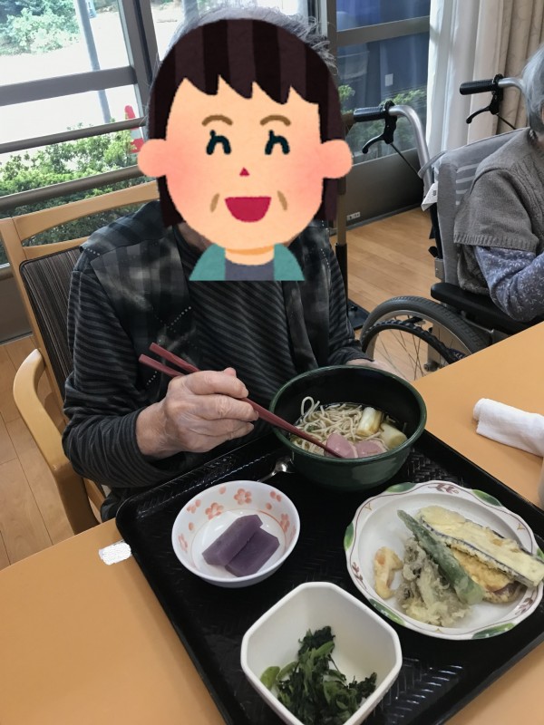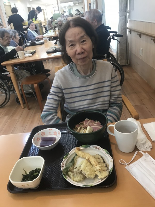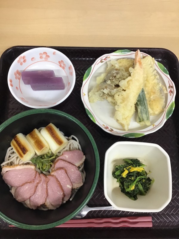 今月は【鴨ねぎそば・天ぷら盛り合わせ・春菊の菊花和え・紫芋ようかん】でした。