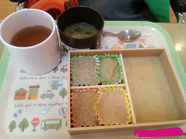 噛むことが難しくても元のお弁当箱にミキサー食で盛り付けました。