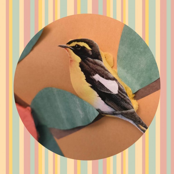 キビタキの絵の裏には黄色いお花紙をクシュクシュっと小さくし貼り、厚みを出します。