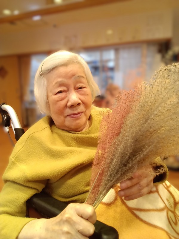 ホーム長がススキの穂を乾燥させた後、水に溶いた染料で着色・再乾燥させた