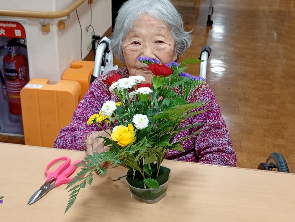 今回は、毎月恒例の1Fデイサービスと合同でフラワーアレンジメントを行ったので
