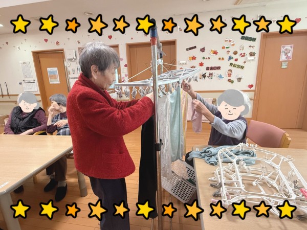 職員と一緒に干していると「私も一緒にやろうか?」とY様も来られたのでお願いすることに…