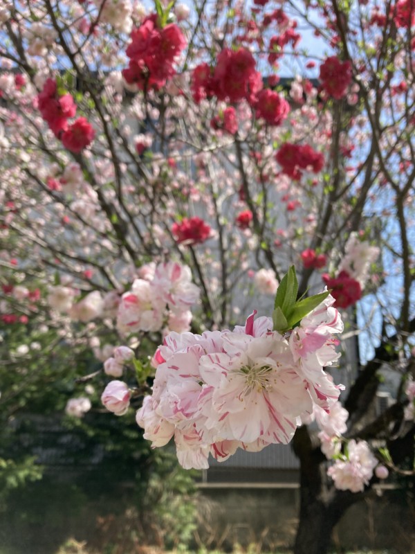 自慢の中庭にある桃が1本の木に赤・白・ピンクと鮮やかに咲くことから、