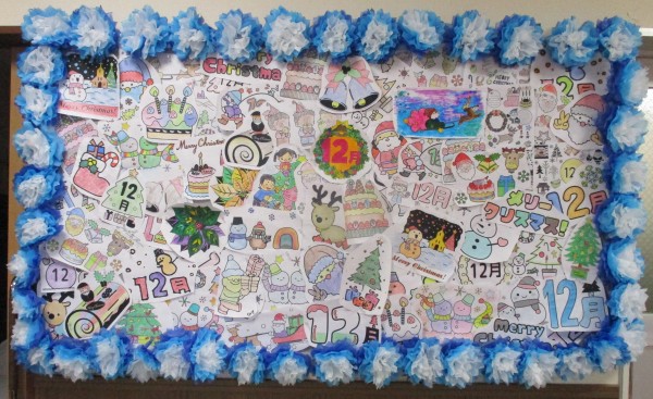 デイの壁紙も12月らしく、クリスマスカラーで華やかに模様替えいたしました。今回も皆様に塗っていただいたステキなイラストと、お花紙で作った雪をイメージしたお花で壁を飾りました。