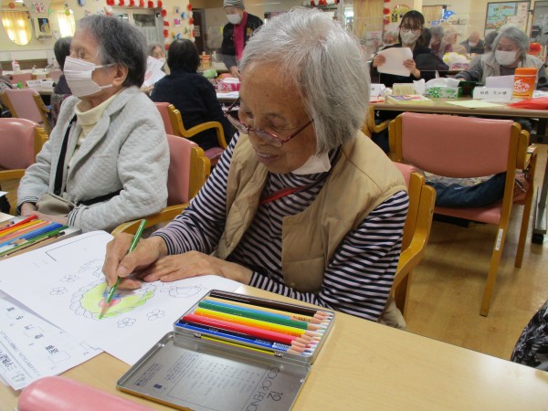 皆様じっくりと色を選び、丁寧に塗り進みながら、「ここは明るい色の方が華やかね」「ここは何色にしようかしら?」と職員や周りの方と会話をたのしみつつ集中されていらっしゃいました。